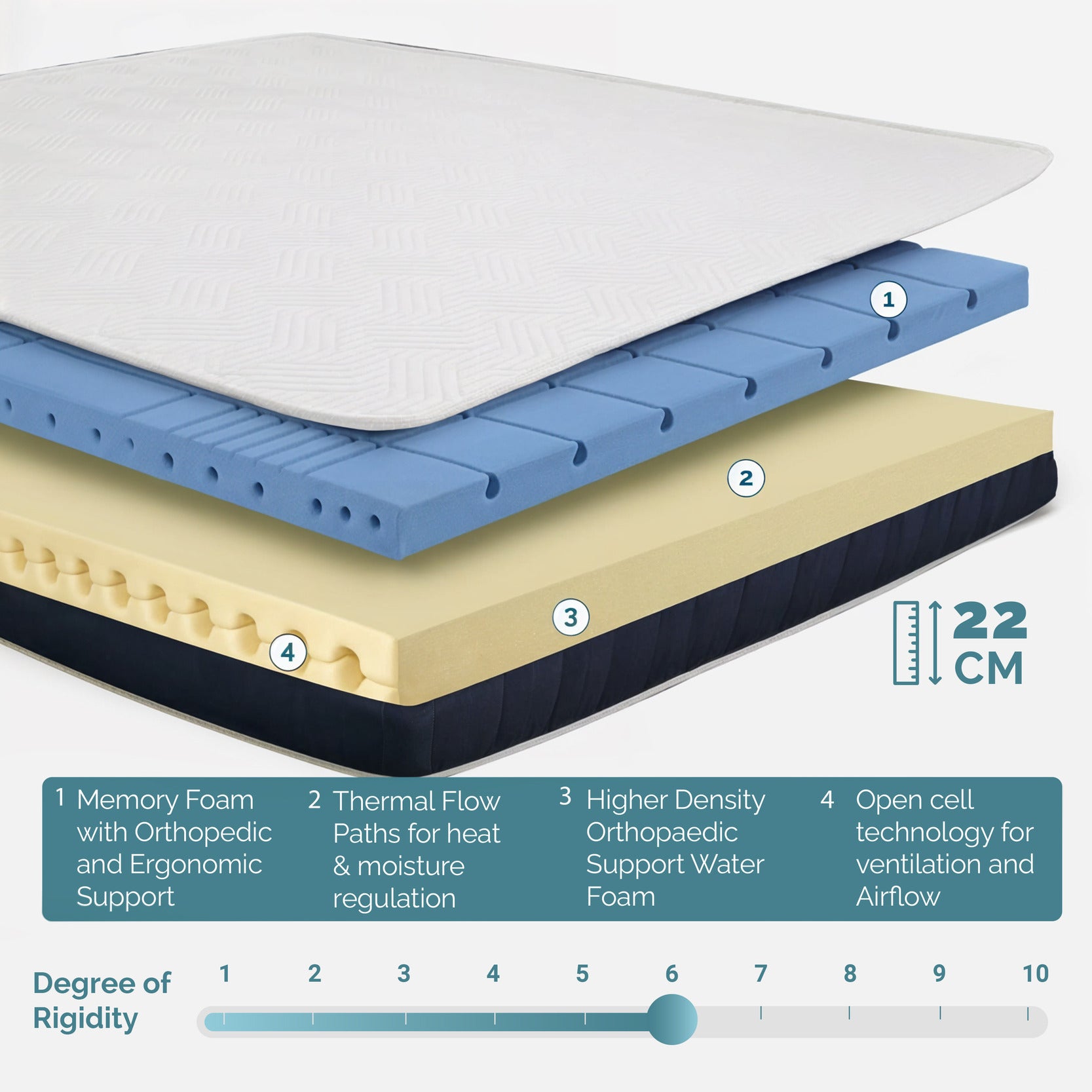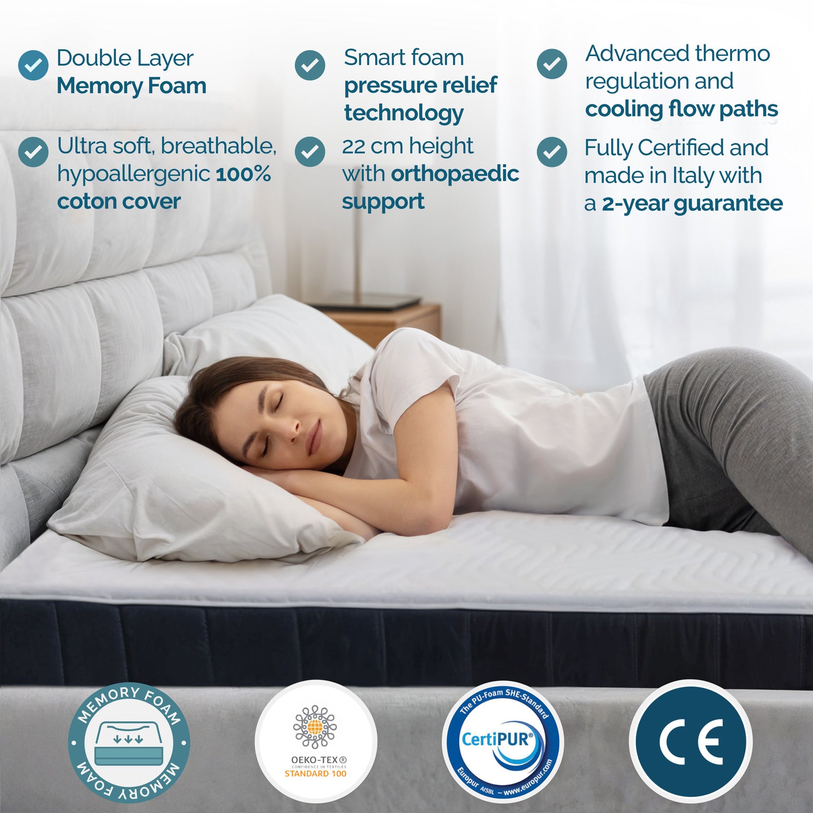 Materasso in Memory Foam, Da morbido a medio rigido, Copertuta in Cotone 100%, Spessore Migliorato